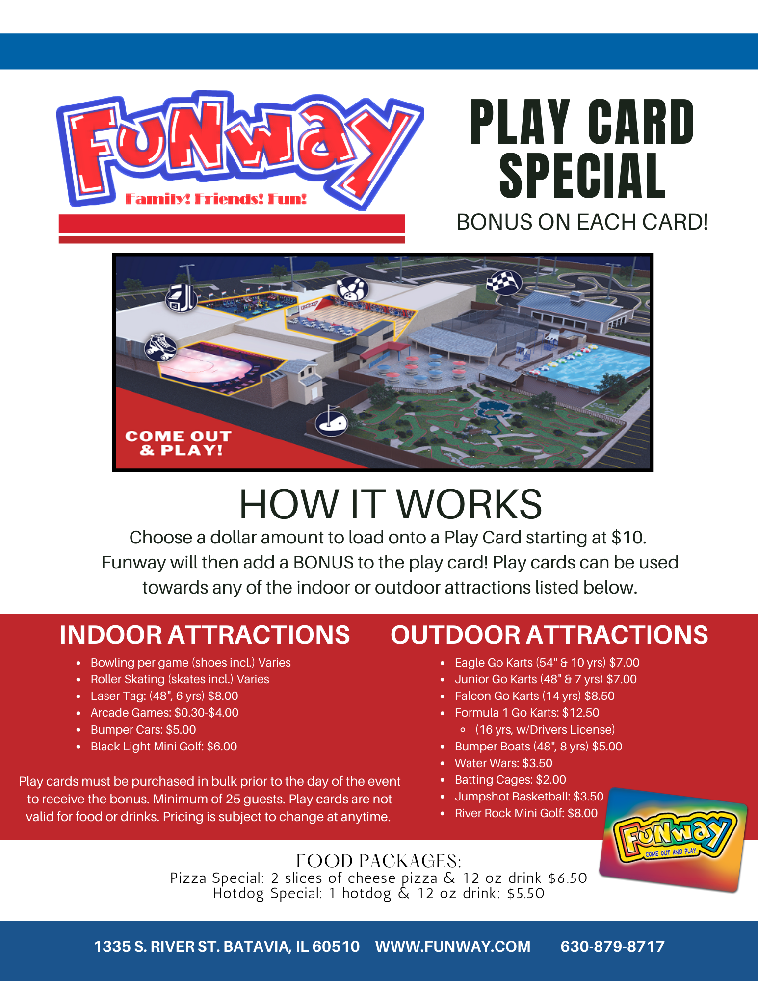 Funway will ADD a BONUS to ANY value Play Card for your Group Outing!